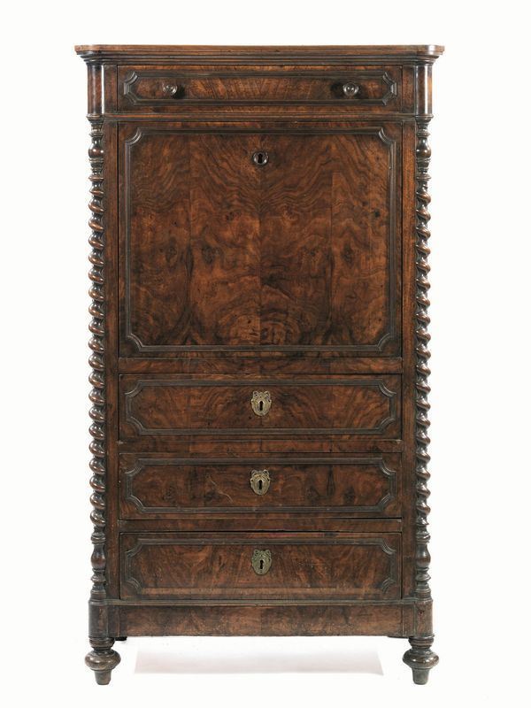 Tavolo, Italia centrale, sec. XVIII, in noce, gambe a lira, traverse in ferro battuto, due cassetti, cm 160x78x80, restauri