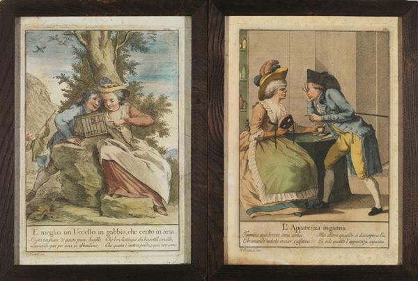 Lasinio, Carlo (Treviso 1759 Pisa 1838) PROVERBI TOSCANI Otto tavole allacquaforte. mm ca. 290x200 cadauno. Cassinelli, III. Da Raccolta di 40 proverbi toscani espressi in figure da Giuseppe Piattoli fiorentino pubblicata a Firenze nel 1786 da Giuseppe Bardi e Niccol├▓ Pagni. Bellissime impressioni con acquerellatura depoca. Tracce diffuse di ossidazione e di foxing, per il resto ottima conservazione. In cornice (8)