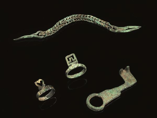 in oro, bronzo e vetro, composto da: un orecchino in oro a testa di ariete, due anelli a chiave, un frammento di bracciale ed una piccola chiave, sedici vaghi da collana in vetro colorato, peso orecchino gr. 4,3 (21)