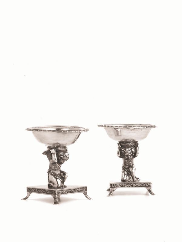 in argento, base rettangolare traforata a viticci, porta ampolle con sostegni terminati a civette, fusto sormontato da nudo femminile, alt. cm 33, g 615, completa di ampolle COPPIA DI SALIERE, MILANO, META' SEC. XIX in argento, base quadrangolare, sostegno modellato a putti alati e inginocchiati che sostengono la coppetta, alt. cm 8,5, complessivi g 290 ( 3 )