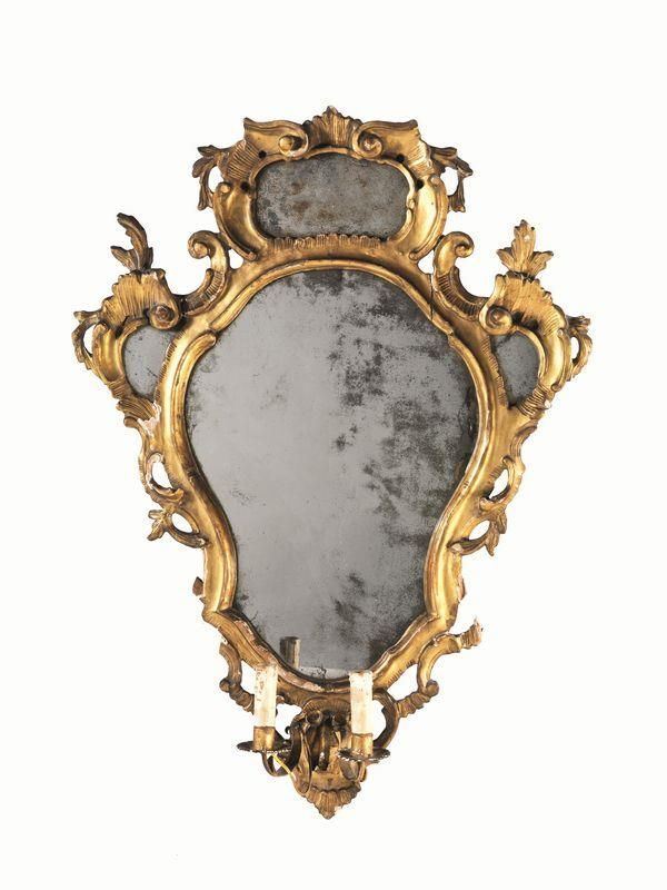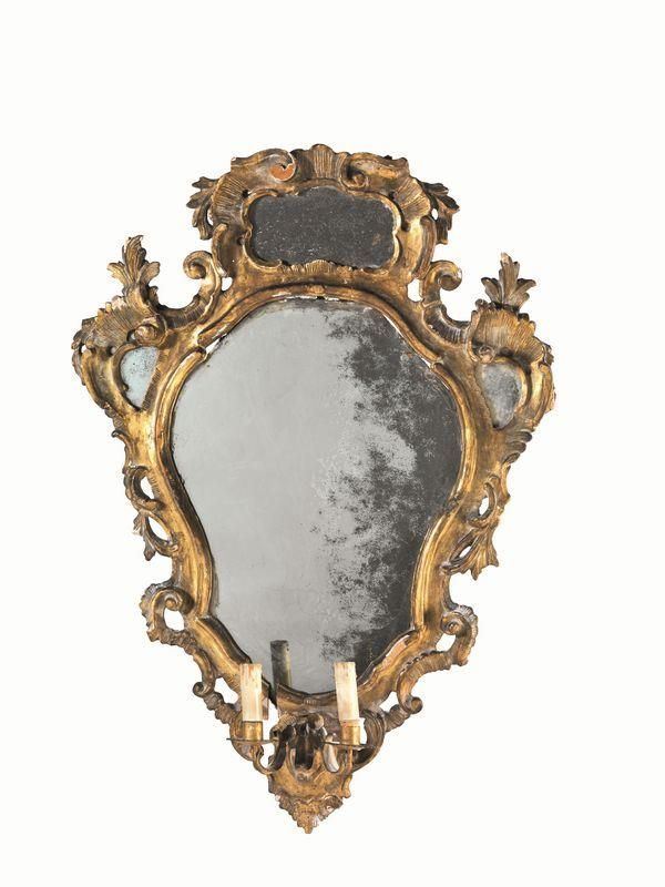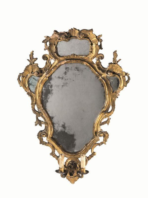 QUATTRO SPECCHIERE A VENTOLA, LOMBARDIA, INIZI SEC. XVIII in legno dorato e intagliato a tralci e volute fitomorfi di gusto rocaille, sormontate da ampia cimasa incorniciata da volute che cadono lungo i fianchi, cornice sagomata, nella parte inferiore due braccetti portacandela adattati a elettricità, cm 83x62 (4) (difetti)