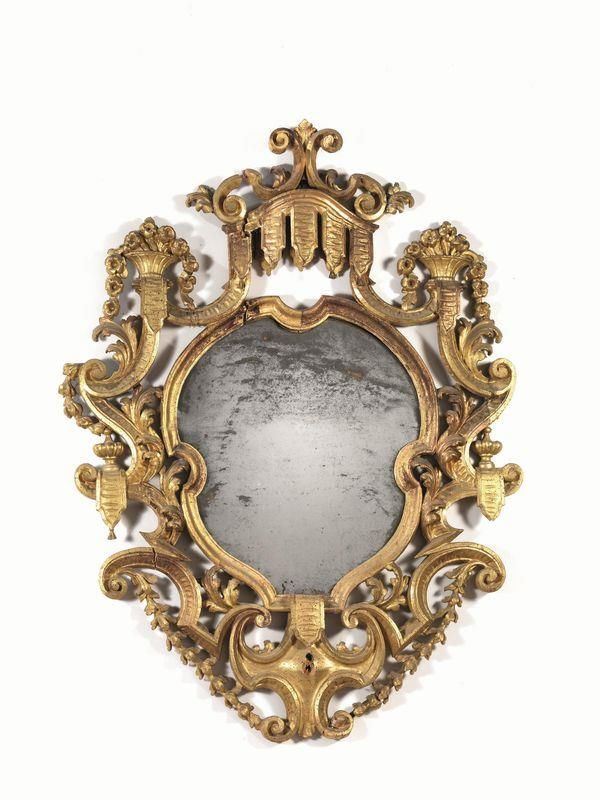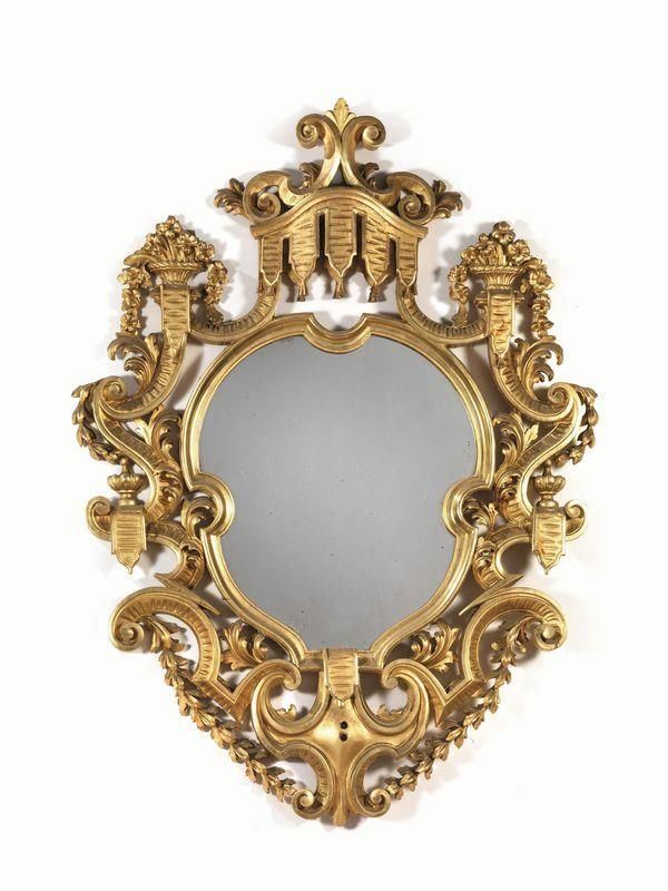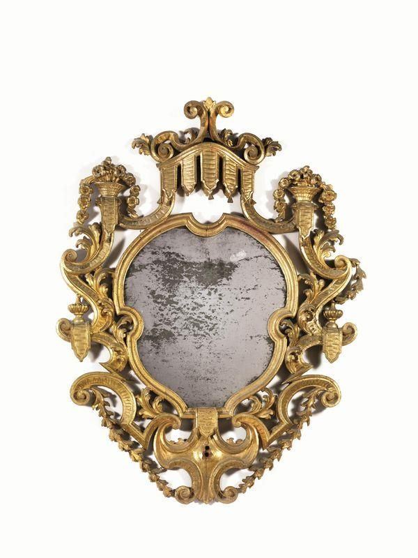 in legno intagliato e dorato, interamente decorata a motivi di volute