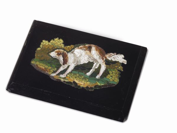 di forma rettangolare in micromosaico su cassina di pasta vitrea nera, una raffigurante Piazza San Marco, cm 4,9x3,9, l'altra raffigurante Cane in un paesaggio, cm 4,5x6