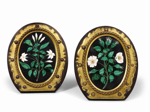 in bronzo dorato, marmo nero e commesso di pietre dure raffiguranti c omposizione floreale; la cornice cm 9,4x6,4, la scatola cm 8,5x21x17,2, le placche cm 17,5x14,8