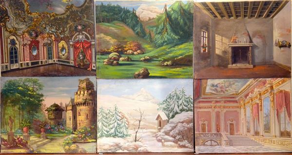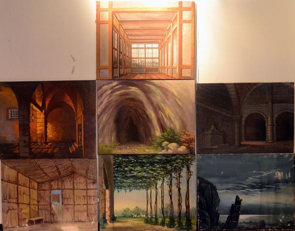 completo di ventidue scene pitturate su tela, cm 179x150x128