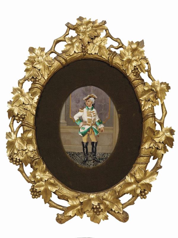 di forma ovale in commesso di pietre dure raffiguranti   Domestica e soldato   in abiti settecenteschi, cm 18,6x14 (ciascuna). Entro cornici in legno      intagliato e dorato