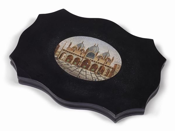 con profilo mistilineo in marmo nero del Belgio e micromosaico ovale     raffigurante Piazza San Marco dal Bacino   e la Basilica di San Marco   cm 8,5x11   e cm 12x16 (2)