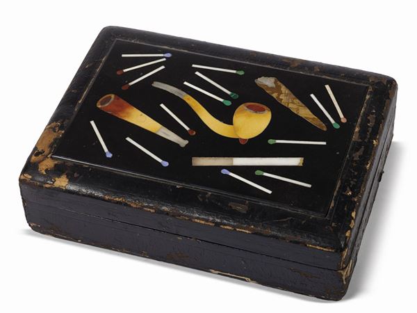 B) in legno rivestito in pelle con placca in marmo nero e commesso di pietre dure raffigurante Pipe, sigari e fiammiferi, cm 6,5x22x16