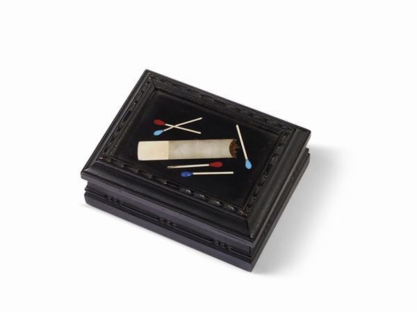 B) in legno ebanizzato con placca in marmo nero e commesso di pietre dure raffigurante Sigari e fiammiferi, cm 4,5x13,2x9