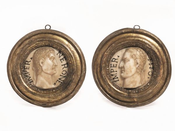 in marmo di forma circolare raffiguranti i profili degli imperatori romani Nerone, Tito e Galba e di Marciana, sorella dell'imperatore Traiano; entro cornici modanate in legno dorato a mecca con battuta intagliata, diam. cm 30