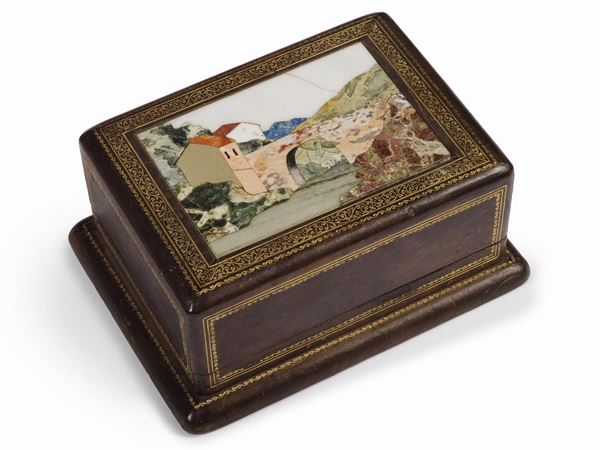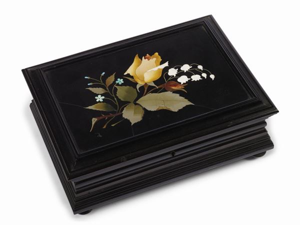 due in legno ebanizzato, una in legno rivestito in pelle decorate da commessi di pietre dure, cm 3,5x8x6,2, cm 7,5x17x13, cm 8x19,5x14