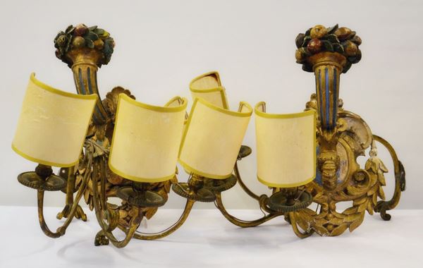 in metallo dorato a tre luci, cm 47x40 Coppia di applique, sec. XX, in legno intagliato, una luce, cm 36x26, difetti e rotture ( 5 )