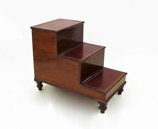 Scaletta da biblioteca, Inghilterra, sec. XIX, in mogano, pedate rivestite in pelle nei toni del vinaccia a profilo bulinato in oro, pedata superiore incernierata e cassetto nel secondo gradino, piedi a trottola, cm 49x82x69