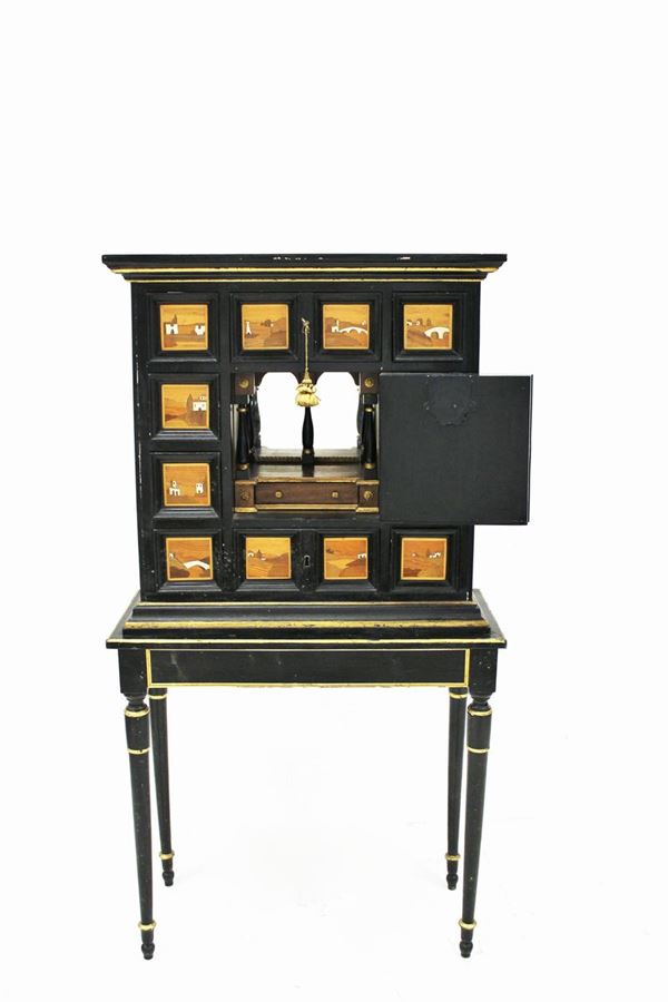 Stipo monetiere, sec. XX, in legno ebanizzato, intarsiato in noce ed osso a motivi paesaggistici, fronte scandito da cassettini e sportello a finti tiretti celante vano a giorno, base ebanizzata a profili lumeggiati in oro gambe tornite, cm 34x87,5x159, difetti