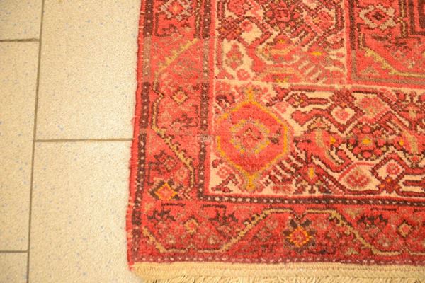 Tappeto persiano Malayer, inizi sec. XX, a disegni geometrici nei toni del rosso, basso in vello, presenta abrash cm 510x200, difetti