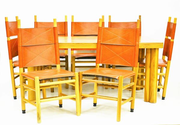 tavolo rettangolare e 8 sedie in legno e cuoio ,