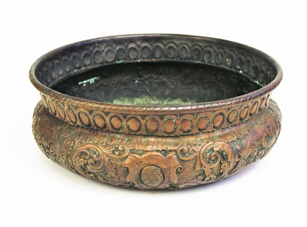 Bacile, Veneto, sec. XVIII, in rame sbalzato, fascia a toro decorata a ghirlande e palmette stilizzate, fascia superiore a embricature, labbro cordonato, sul fondo stella ad otto punte, cm 52,5x44x12