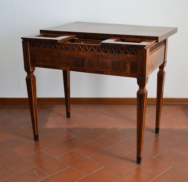 Scrivania, sec. XVIII-XIX , in noce intarsiato, piano scorrevole con all'interno vani e cassettini, gambe troncopiramidali, cm 89x56x79,5