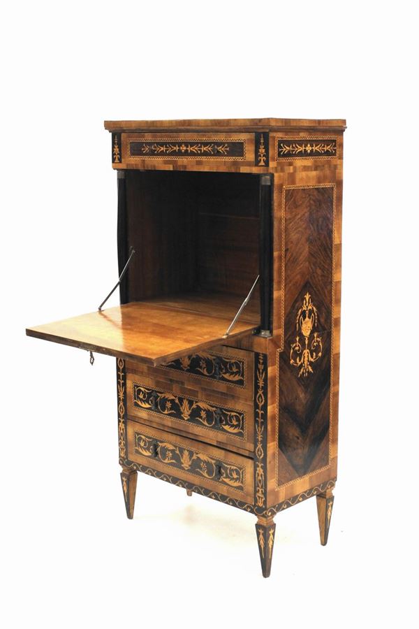 Mobile bar, in stile Luigi XVI, lastronato e intarsiato in varie essenze,