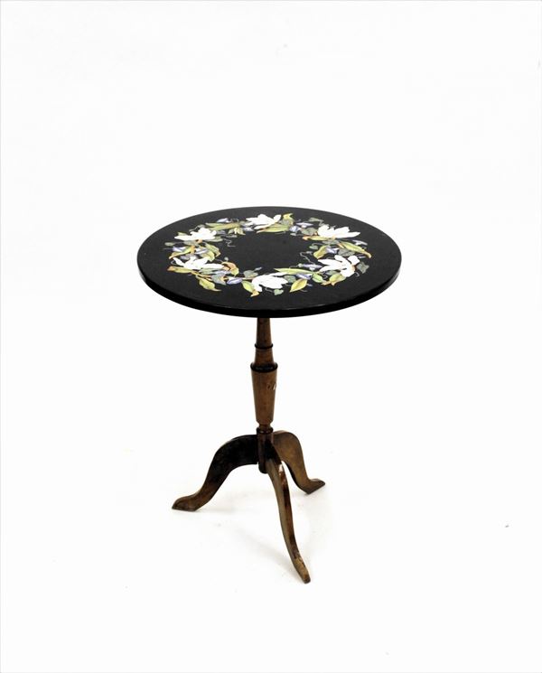 Piano circolare, sec. XX, in marmo nero del Belgio, decorato in scagliola a
