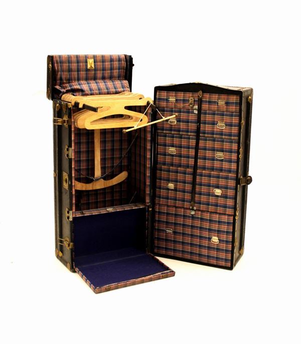 Baule armadio da viaggio, sec. XX, in legno laccato nero e rapporti metallici e borchiature bronzate, interno a cassetti e bastone appendiabiti, cm 60x60x115