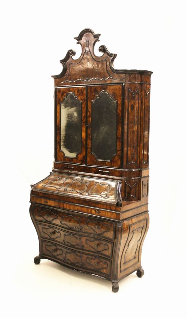 Trumeau bureau, in stile lombardo del settecento, lastronato in radica di noce, riserve e profili rilevati ebanizzati, fronte e fianchi mossi, corpo superiore a due sportelli vetrati sagomati dall’andatura mistilinea, sottesi da coppia di piccole tablettes estraibili porta candelabro, cimasa di gusto architettonico, corpo inferiore a ribalta celante due file sovrapposte di tre tiretti dal fronte mosso, sottesa da cassetto a tutta lunghezza, tre cassetti seguono l’ andatura dei fianchi, piedi a ricciolo, cm 118x52x245