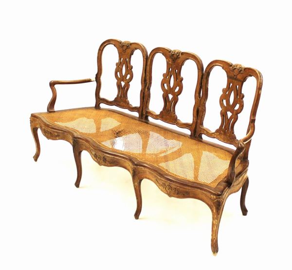 Divano, sec. XVIII, in noce, schienale tripartito a cartelle sagomate e