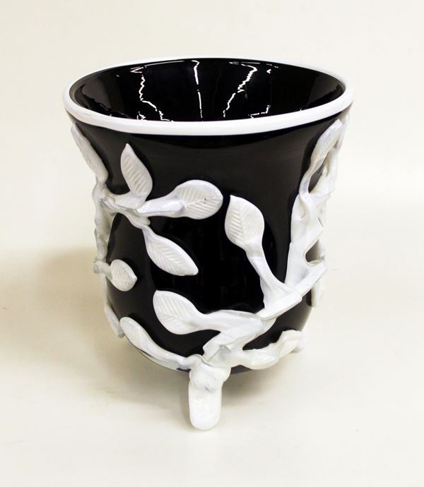 Vaso, sec. XX, in vetro nero con applicazioni in vetro lattimmo a motivo di