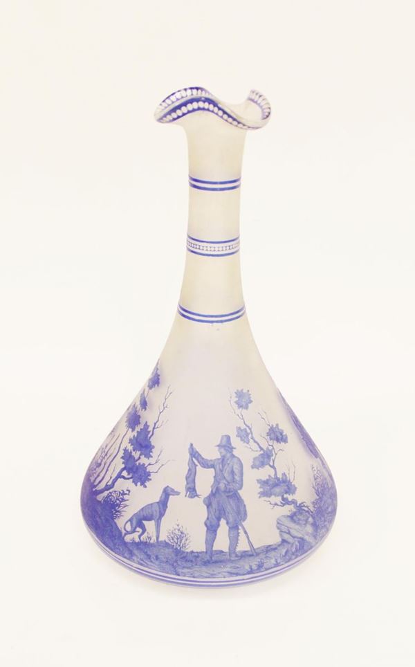 Vaso, sec. XIX/XX, in vetro satinato decorato a cameo in blu a scene di