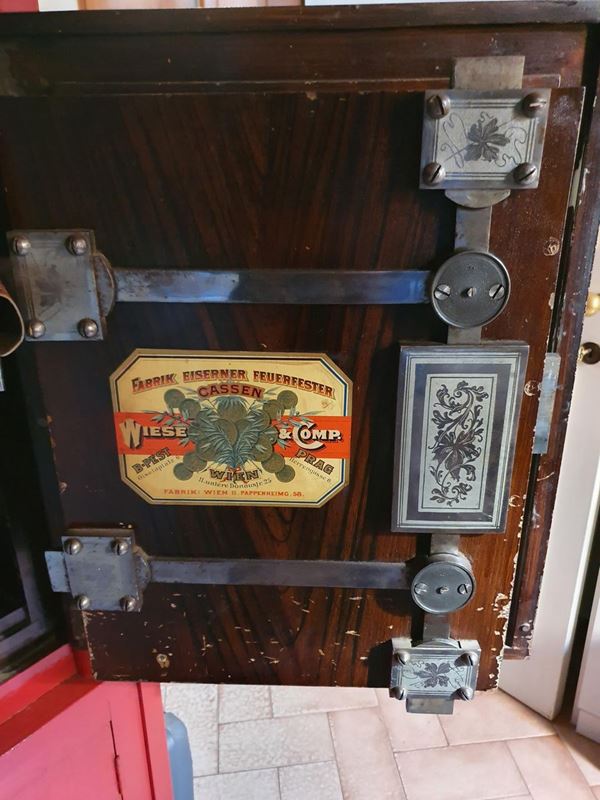 Cassaforte, Vienna, sec. XIX, laccata rossa con base in legno, manifattura