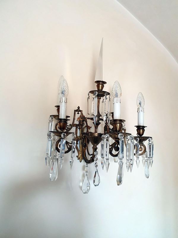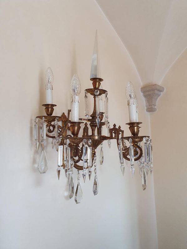 Coppia di applique, inizi sec. XX, in metallo dorato, con gocce, cm 48x58