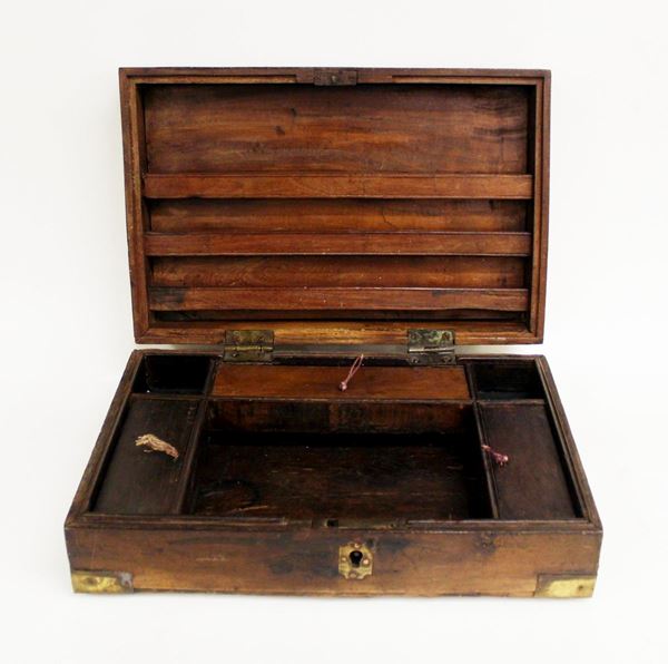 Scrittoio da viaggio, arte indiana, sec. XX, in legno di teak, coperchio