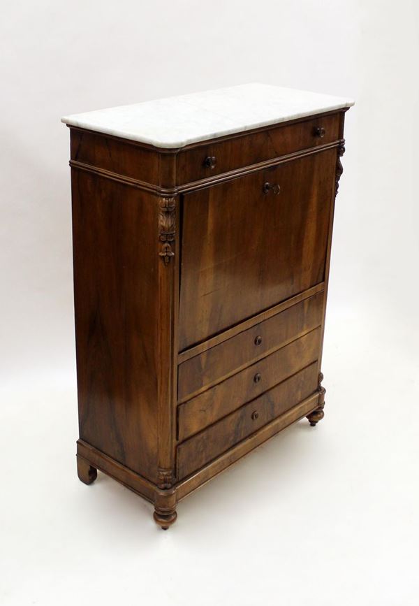 Secretaire, sec. XIX, piano in marmo bianco, fronte a quattro cassetti e