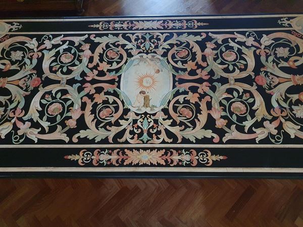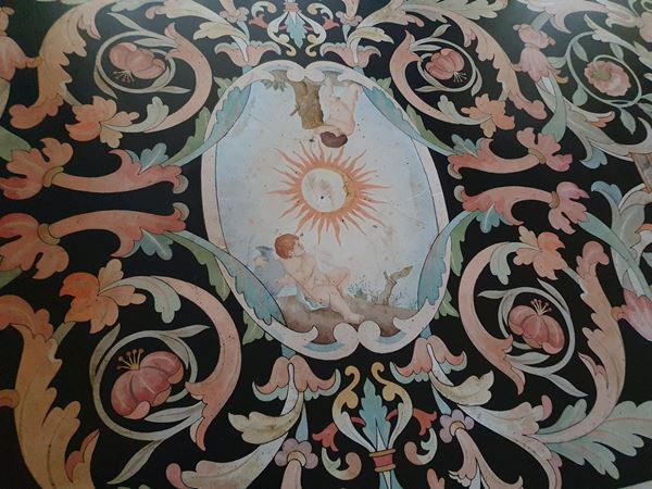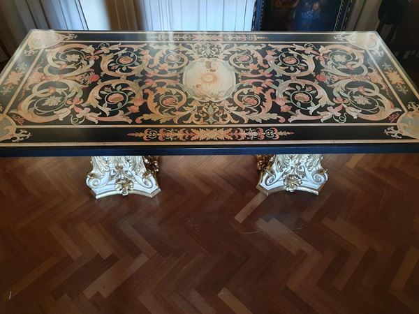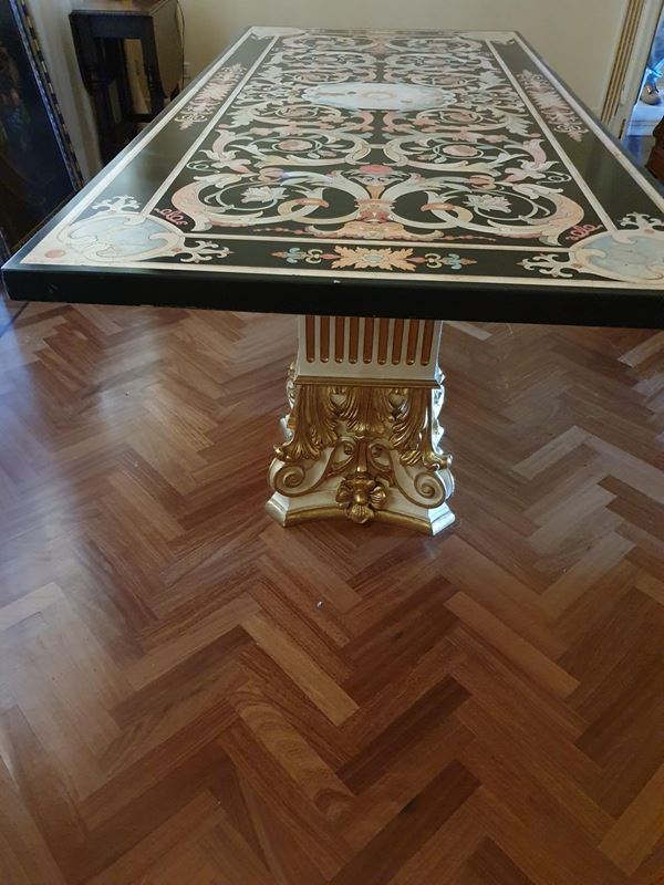 Tavolo, in stile 700, piano in scagliola, base a colonne desineti in
