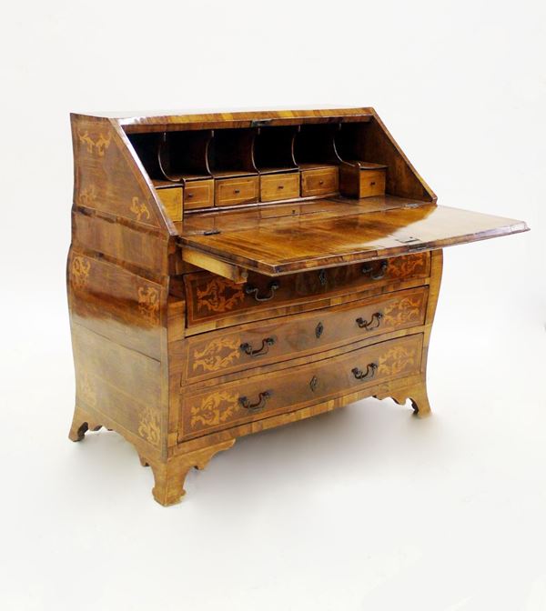lastronata in noce e intarsiata in acero a motivi fogliati, fronte mosso a
