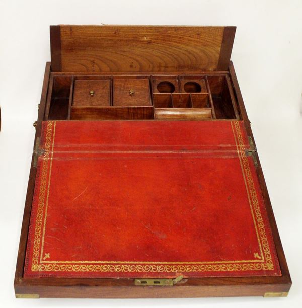 in noce, celante piano inclinato in pelle nei toni del rosso, comparti