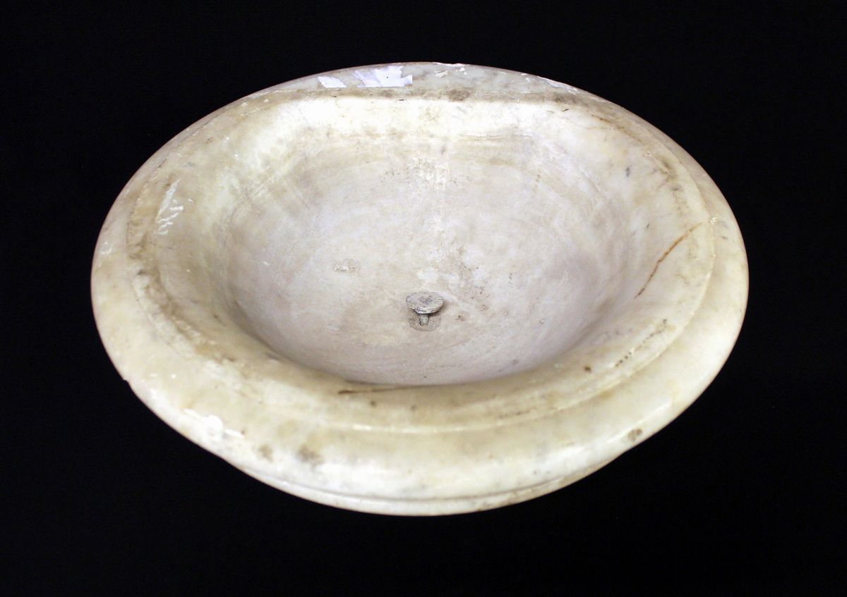 in marmo, vasca circolare fascia decorata a motivi cruciformi, base