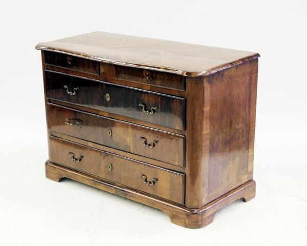 lastronato in noce, piano sagomato, fronte a due cassetti allineati sottesi da tre cassetti a tutta lunghezza, piedi a mensola, cm 133x65x91