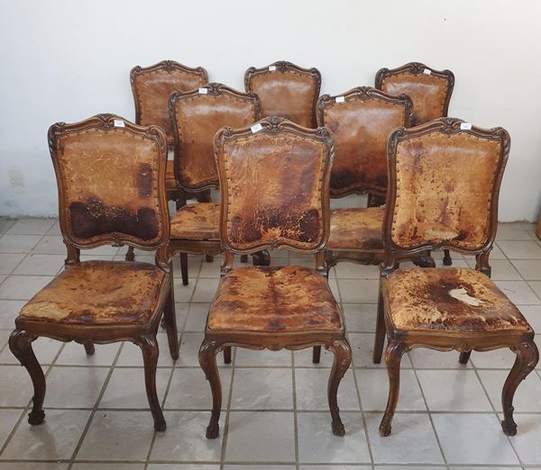 in noce intagliato, sedute e schienali imbottiti e ricoperti in cuoio, alt. cm 105, da restaurare Il ritiro del presente lotto potrà avvenire solo in loco e su appuntamento ove questo si trova, in Via di Brana 300, Ferruccia (PT). Il ritiro in loco sarà disponibile, su appuntamento e su indicazione dei nostri uffici, solamente a bonifico riscontrato o a pagamento effettuato direttamente presso la sede di Via Poggio Bracciolini, 26.