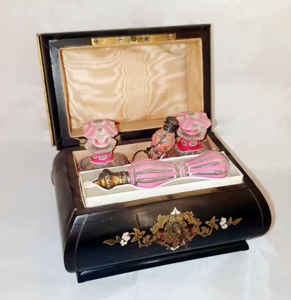 entro scatola intarsiata in metallo e madreperla, internamente quattro