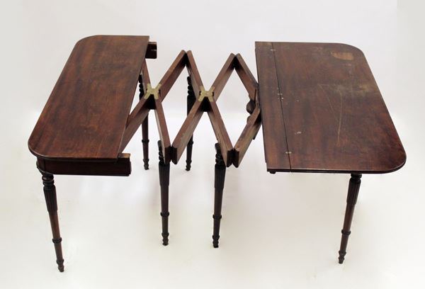 in mogano, piano incernierato fascia rettilinea, otto gambe tornite e