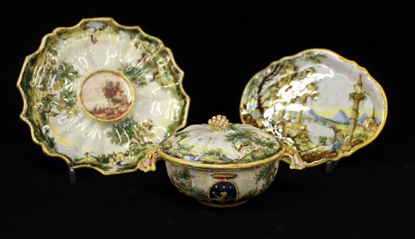 in ceramica dipinta in policromia a motivi di rovine e paesaggio, nello