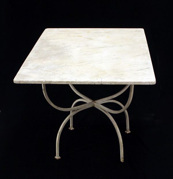 in ferro laccato bianco e ottone, piano del tavolo in marmo, faldistori
