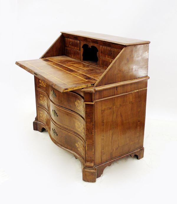 in noce, intarsiato in acero, fronte mosso a tre cassetti a tutta