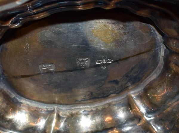in argento sbalzato e cesellato , manico a voluta