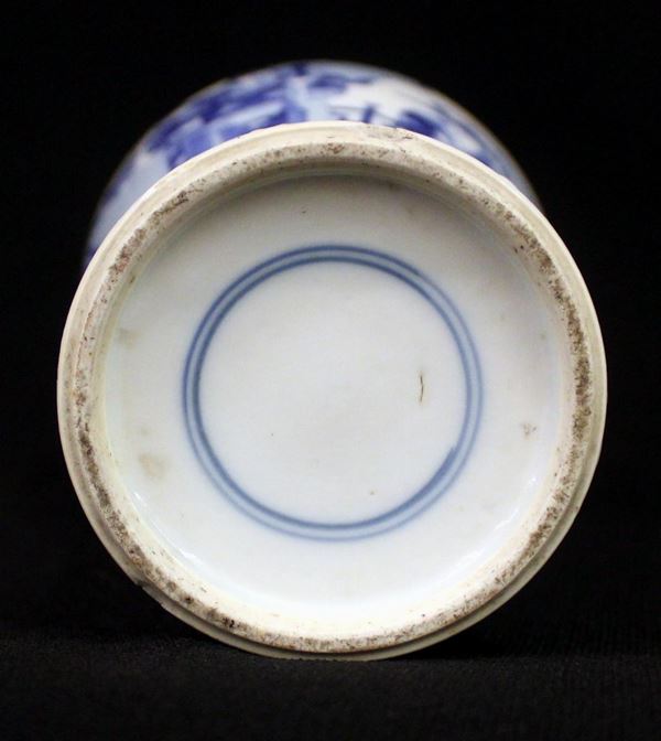 in porcellana bianco blu, corpo sciancrato, decorata a motivi figurati,