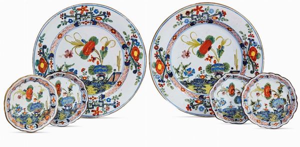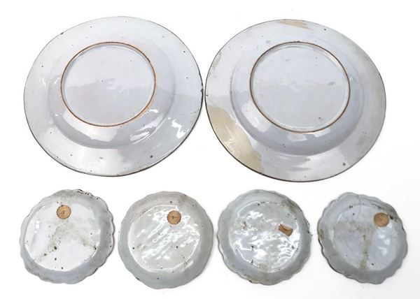 Due piatti e quattro piattini, Faenza, manifattura Ferniani, seconda metà