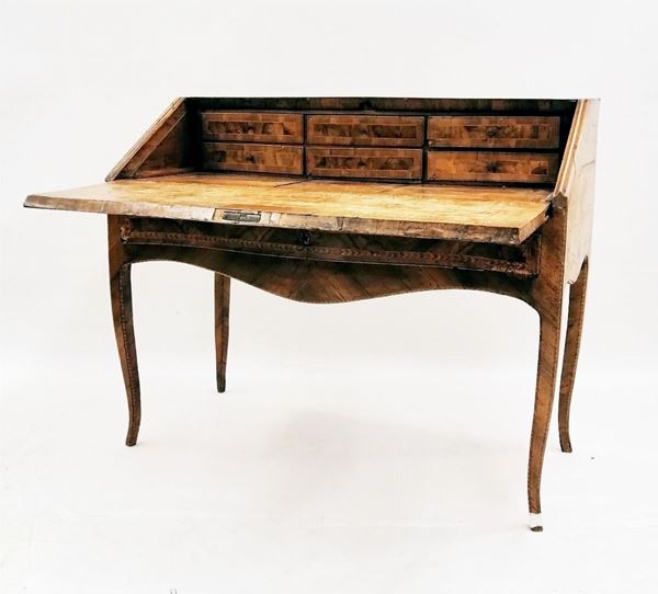in noce intarsiato, un cassetto ed uno sportello celante cassettini e vani,