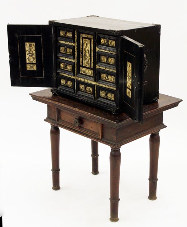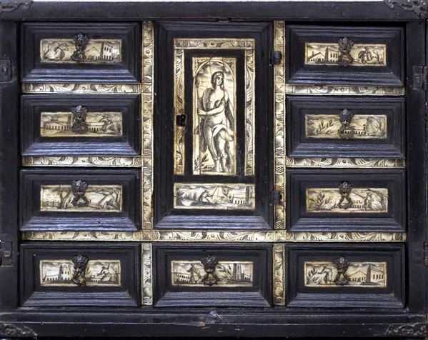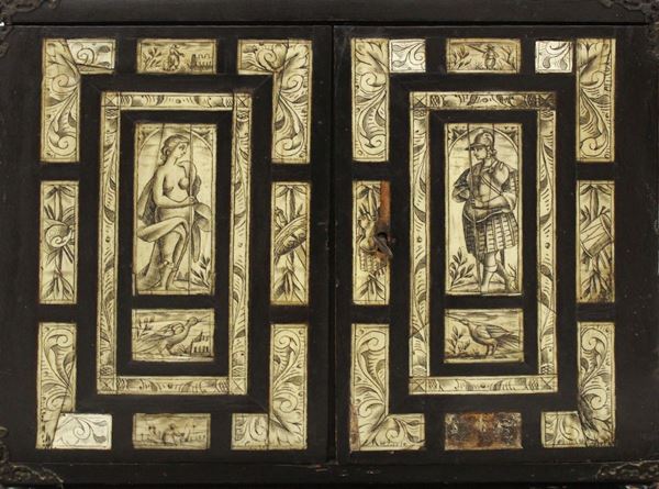 in legno ebanizzato intarsiato in osso, fronte a due sportelli celanti