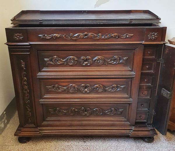 Cassettone, in stile Rinascimento, in noce, tre cassetti, piano da alzarsi,